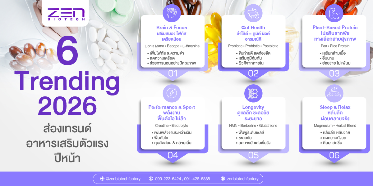 Main Homepage – Zenbiotech 2025 ZEN BIOTECH Business Factory เราภูมิใจที่ได้เป็นส่วนหนึ่งของความ “สำเร็จ” กำลังการผลิตต่อเดือน (กล่อง) 0 M สูตรผลิตภัณฑ์ขึ้นทะเบียน อย. 0 จำนวนสิทธิบัตร และรางวัล 0 ความพึงพอใจของลูกค้า 0 % Dr. Kim In Sang Herbal and FIR expertsDr. Ponwanit Charoenputtakun Expert in induction technology and extractDr. Supawadee Sirimart , M . D . Expert Otolaryngology รูปแบบอาหารเสริม “ยอดนิยม” รูปแบบเครื่องสำอาง “ยอดนิยม” STANDARD & “AWARD“ ขั้นตอนการสร้างแบรนด์แบบ “ORM” ข้อมูลสารสกัดและนวัตกรรมใหม่ๆ 6 Trending Supplements 2026รูปแบบอาหารเสริม ยอดนิยอมรีเซ็ตร่างไว หลังปาร์ตี้หนักทำไมหลายแบรนด์ดังเลือก ZENBIOTECHโค้งสุดท้าย Highlight Trend ปลายปี 2025 เทรนด์อาหารเสริมยังพุ่ง!8 วิตามินที่คุณหมอเลือกแล้วว่า ‘ขาดไม่ได้’ ข่าวทั้งหมด ติดต่อเรา 36/52 Moo. 13 Bueng Kham Phroi,Lamlukka, Pathumthani02 1031713091-428-6888099-223-6424marketing@zenbiotechfactory.com Google Map