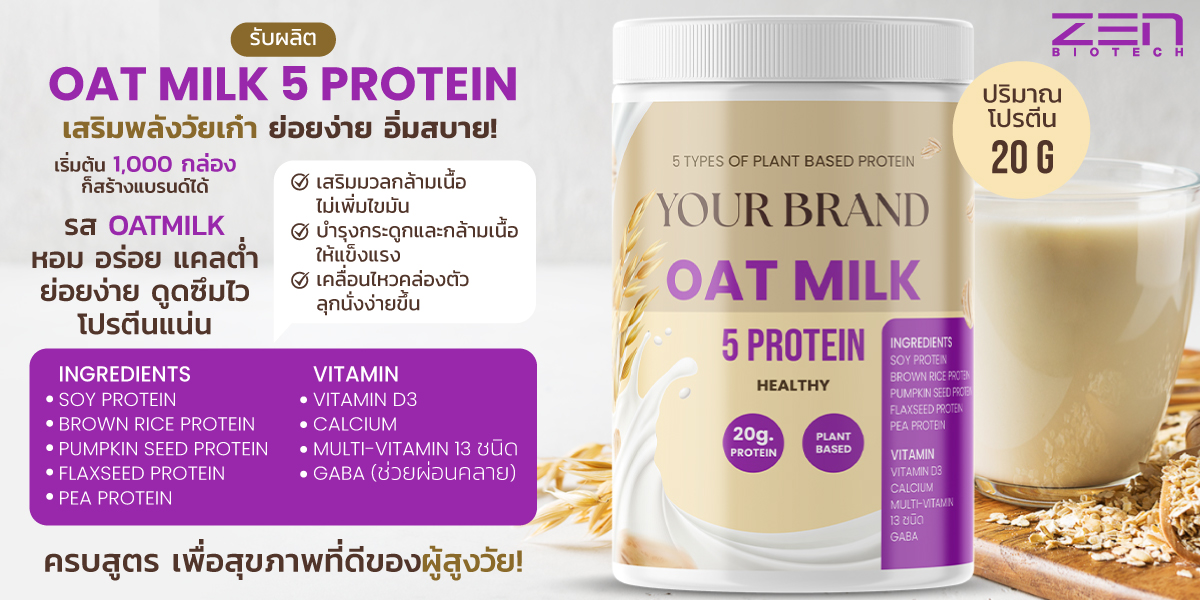 Oat milk 5 Protein เสริมพลังวัยเก๋า ย่อยง่าย อิ่มสบาย! รายละเอียด : เริ่มต้น 1,000 กล่อง ก็สร้างแบรนด์ได้ จุดเด่นของผลิตภัณฑ์ (หัวข้อไม่ต้องใส่ข้อความ) ✅ เสริมมวลกล้ามเนื้อ ไม่เพิ่มไขมัน ✅ บำรุงกระดูกและกล้ามเนื้อให้แข็งแรง ✅ เคลื่อนไหวคล่องตัว ลุกนั่งง่ายขึ้น คุณสมบัติพิเศษ (หัวข้อไม่ต้องใส่ข้อความ) ? รส OATMILK หอม อร่อย แคลต่ำ ? ย่อยง่าย ดูดซึมไว โปรตีนแน่น ปริมาณโปรตีน ⚡ 20g KEY INGREDIENTS Soy Protein Brown Rice Protein Pumpkin Seed Protein Flaxseed Protein Pea Protein Vitamin VITAMIN … Oat milk 5 Protein เสริมพลังวัยเก๋า